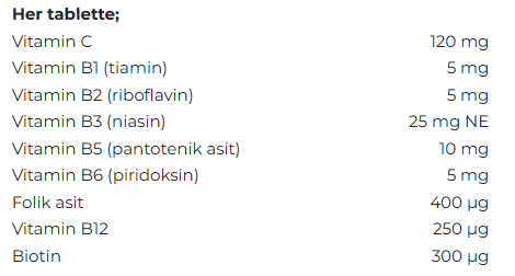 "Tiamin (B1 vitamini), B3 (niasin), Pantotenik asit, Biotin, B12, B6, B2 normal enerji oluşum metabolizmasına katkıda bulunur."*