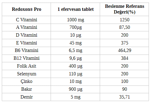 Redoxon Ailesi'nin en gelişmiş formülü olan Redoxon Pro, tam 11 ve vitamin ve mineral içerir. Redoxon Pro içeriğinde yer alan vitamin ve minerallerden bazıları; C, D vitaminleri, çinko ve selenyum olarak sıralanabilir. Bu vitamin ve mineraller bağışıklık sisteminin normal fonksiyonunu destekler. Redoxon Pro buna ek olarak 7 farklı vitamin ve mineral daha içerir.