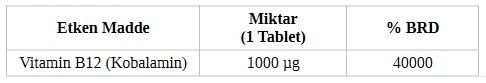 Tatlandırıcı (İzomalt), Stabilizör (Polivinilpolipirolidon), Topaklanmayı önleyici (Yağ asitlerinin magnezyum tuzları), Metilkobalamin (Vitamin B12 kaynağı).